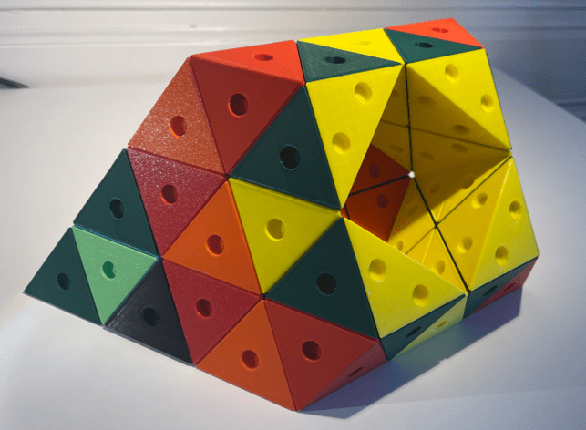 The rules also apply to larger Abies. To comply with them you need to remember if a peghole originally belonged to a small face of an Abi-D; to the large face of an Abi-D; or to one of the faces of an Abi-C. For larger constructions this is not always easy. For example: of the three dark-green triangles on the left and the one light-green triangle, can you say which belong to an Abi-C and which to an Abi-D? Here is the answer: the dark green triangles belong to an Abi-C, and therefore may only be connected to an Abi-D. The light green triangle belongs to an Abi-D and since it is its large face it may therefore only be connected to an Abi-C. Don’t worry about it, you can enjoy playing with Abies without having all this in your head.